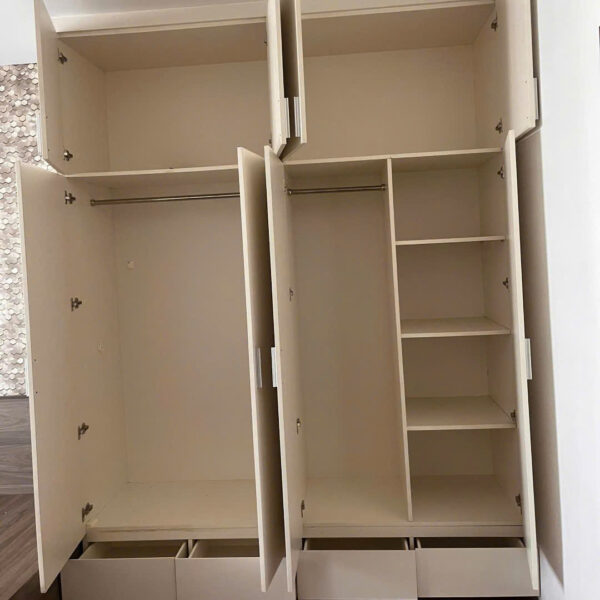 Chủng loại: Tủ quần áo 4 cánh + ngăn tủ trên + kèm học kéo, thiết kế kịch trần, tối ưu không gian.