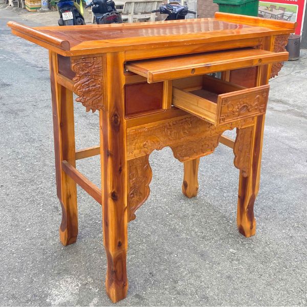 - Mô tả: Tủ kệ thờ Gia tiên gỗ tự nhiên thanh lý được làm từ gỗ chắc chắn, vân gỗ đẹp, màu sắc trầm ấm tạo không gian thờ cúng trang nghiêm. Thiết kế truyền thống kết hợp hiện đại, mặt kệ rộng rãi, dễ bố trí bát hương, bài vị và đồ thờ. Sản phẩm còn bền đẹp, kết cấu vững chắc, sử dụng lâu dài theo thời gian. Sản phẩm thanh lý đã qua sử dụng, gỗ dày dặn, như mới.
