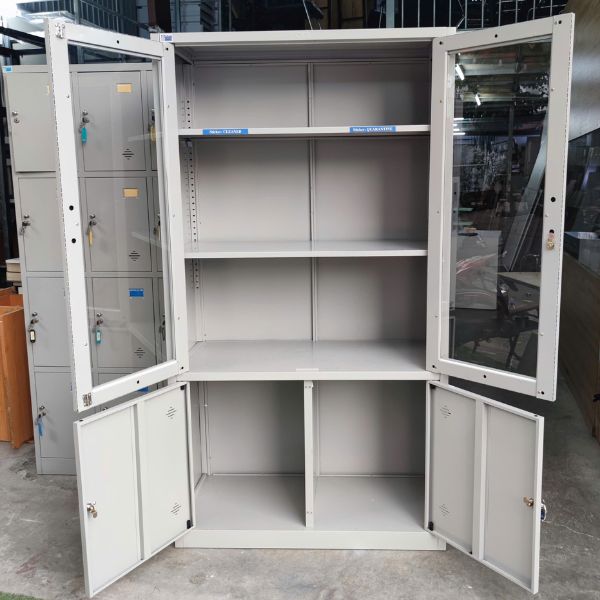 - Mô tả: Tủ sắt 4 cánh với thiết kế nửa trên cửa kính, nửa dưới cửa sắt là giải pháp lưu trữ hồ sơ, tài liệu thông minh cho văn phòng, trường học, bệnh viện. Phần trên cửa kính giúp dễ dàng quan sát, trưng bày sách, hồ sơ, tài liệu cần tìm nhanh chóng, trong khi phần dưới bằng sắt kín đáo, an toàn để cất giữ giấy tờ quan trọng. Chất liệu thép sơn tĩnh điện cao cấp, chống gỉ sét, bền bỉ theo thời gian. Tủ được trang bị khóa an toàn, tay nắm chắc chắn, kết hợp màu ghi sáng trang nhã, phù hợp với mọi không gian làm việc. Với kiểu dáng gọn gàng, tủ sắt 4 cánh kính trên – sắt dưới không chỉ giúp quản lý tài liệu khoa học mà còn mang lại sự chuyên nghiệp và hiện đại cho không gian của bạn.