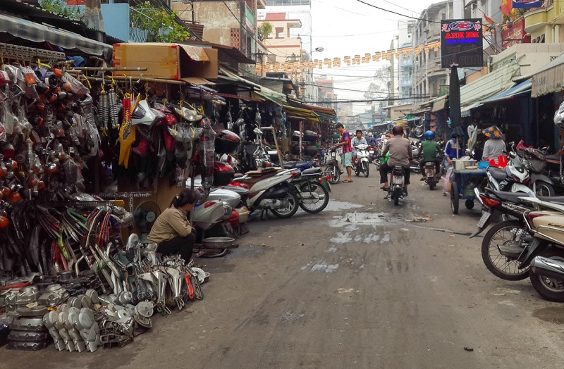 Chạy một vòng quanh chợ bạn sẽ thấy, trải dài 2 bên đường là rất nhiều các cửa hàng nằm cạnh nhau, bán tất tần tật từ con ốc nhỏ gắn trên xe, cho đến các động cơ máy lớn. Ở đây buôn bán sỉ và lẻ đầy đủ các loại mặt hàng liên quan đến xe máy. Từ những món đồ phụ tùng chính hãng cho đến các món đồ chơi xe máy cao cấp. Từ các thương hiệu nổi tiếng như RCB, Brembo, Ohlins, Nitron,…