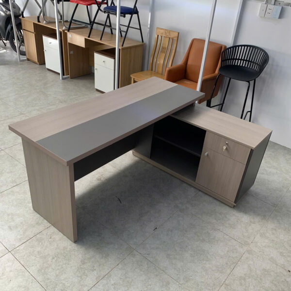 - Mô tả: Chiếc bàn giám đốc gỗ công nghiệp phối màu hiện đại là lựa chọn lý tưởng cho không gian văn phòng chuyên nghiệp và trang nhã. Thiết kế mặt bàn hình chữ nhật rộng rãi, kết hợp cùng các đường nét góc cạnh rõ ràng tạo cảm giác vững chãi và tinh tế. Màu nâu ghi trầm chủ đạo được phối cùng chỉ vàng chạy ngang thân bàn, không chỉ tạo điểm nhấn nổi bật mà còn giúp tổng thể trở nên sang trọng, hiện đại hơn. Chân bàn chắc chắn, liền khối với mặt bàn giúp sản phẩm luôn ổn định trong quá trình sử dụng. Phía chân bên trái là tủ tích hợp, thích hợp để lưu trữ tài liệu, hồ sơ, vật dụng cá nhân một cách gọn gàng. Từng chi tiết nhỏ đều được hoàn thiện kỹ lưỡng, phù hợp với những ai đang tìm kiếm một không gian làm việc thể hiện sự chuyên nghiệp và bản lĩnh lãnh đạo.