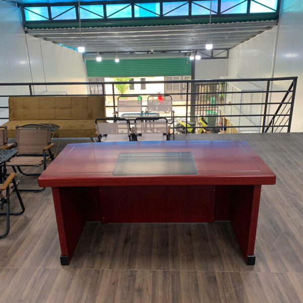 - Mô tả: Chiếc bàn giám đốc mang tông đỏ đô sang trọng, mặt bàn rộng rãi với điểm nhấn màu đen trang trí trung tâm tạo sự cân bằng giữa cổ điển và hiện đại. Bề mặt phủ sơn bóng đẹp, các chi tiết phào chỉ được gia công tỉ mỉ, vừa cứng cáp vừa có tính thẩm mỹ cao. Phần chân bàn được thiết kế vững chắc, chịu lực tốt, phù hợp với không gian phòng làm việc lãnh đạo cần sự chỉnh chu, đẳng cấp. Đây là mẫu bàn thích hợp cho giám đốc, quản lý cấp cao hoặc làm bàn hội trường nhờ kiểu dáng uy nghiêm và kích thước chuẩn công năng.