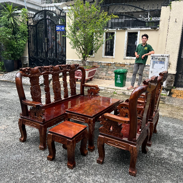 - Mô tả: Bộ bàn ghế gỗ tay 8 được chế tác thủ công từ gỗ tự nhiên, bề mặt phủ bóng mịn, tôn lên màu sắc sang trọng và độ bền vượt thời gian. Điểm nhấn nổi bật là phần tay ghế bản lớn cùng những đường chạm khắc tinh xảo, mang lại vẻ đẹp cổ điển nhưng không kém phần bề thế cho không gian. Bộ sản phẩm gồm ghế băng dài, ghế đơn, bàn trà và ghế đôn, đáp ứng đầy đủ nhu cầu sử dụng trong phòng khách. Chất liệu gỗ dày dặn, chắc chắn, ít cong vênh, đảm bảo sử dụng lâu dài. Với thiết kế tỉ mỉ, từng chi tiết đều toát lên sự tinh tế, giúp tôn vinh giá trị thẩm mỹ và đẳng cấp của gia chủ. Đây là lựa chọn lý tưởng cho những ai yêu thích sự sang trọng và cổ điển trong nội thất gỗ.