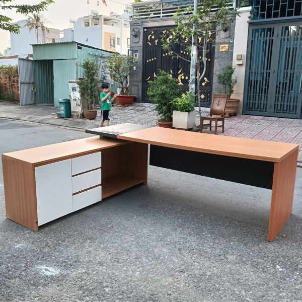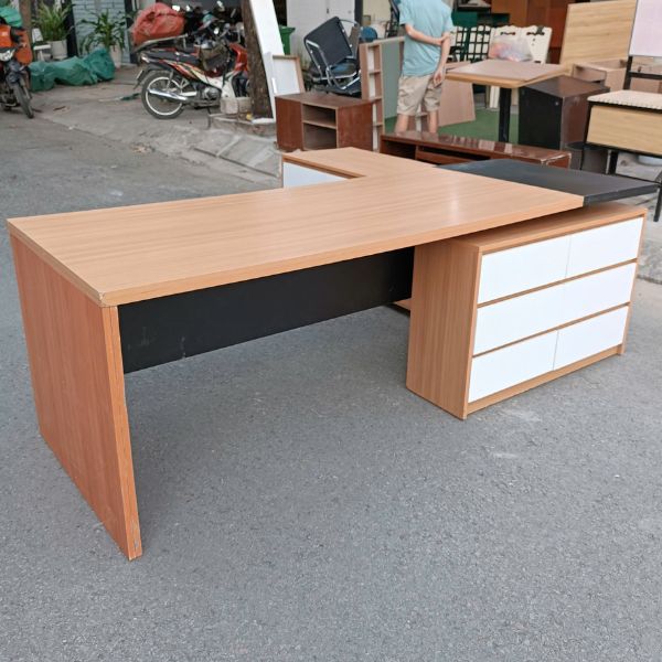 - Mô tả: Bàn làm việc Giám đốc chữ L MDF 2m3 thiết kế rộng rãi, phù hợp không gian phòng lãnh đạo chuyên nghiệp. Chất liệu gỗ MDF dày dặn, bề mặt phủ Melamine chống trầy, chống ẩm, sử dụng bền lâu. Kiểu dáng chữ L giúp tối ưu diện tích, thuận tiện bố trí máy tính, hồ sơ và phụ kiện làm việc. Sản phẩm thanh lý giá rẻ, như mới, mua về sử dụng ngay.