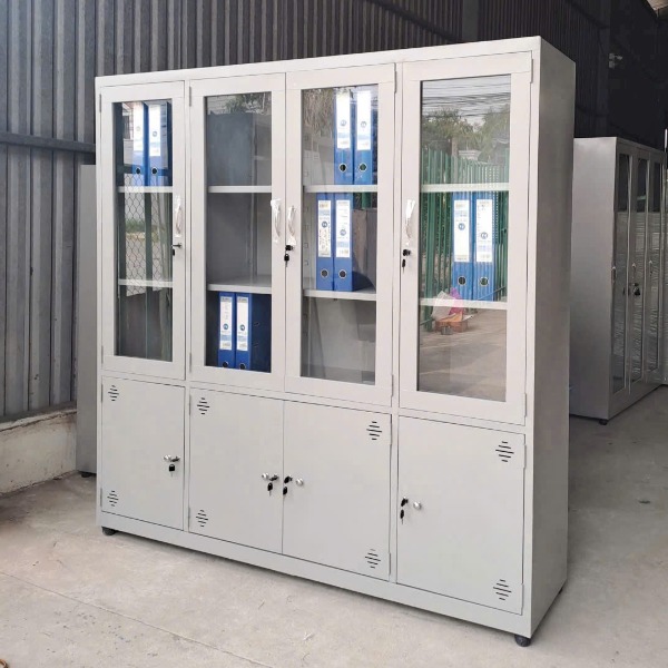 - Mô tả: Tủ sắt văn phòng 2 cánh kính là giải pháp lưu trữ và trưng bày hồ sơ tài liệu tiện dụng. Phần trên với 2 cánh kính trong suốt, dễ dàng quan sát và sắp xếp sách vở, tài liệu, vật dụng cần thiết. Bên dưới là 2 cánh tủ sắt có khóa chắc chắn, bảo quản an toàn các loại hồ sơ quan trọng và vật dụng cá nhân. Chất liệu thép sơn tĩnh điện chống gỉ bền bỉ, màu ghi sáng hiện đại phù hợp nhiều không gian làm việc. Thiết kế gọn gàng, ngăn nắp, vừa giúp quản lý tài liệu khoa học vừa mang lại sự chuyên nghiệp cho văn phòng, trường học, cơ quan hành chính. Đây là sản phẩm hữu ích, kết hợp giữa tính thẩm mỹ và công năng, đáp ứng nhu cầu lưu trữ an toàn, tiện lợi lâu dài.